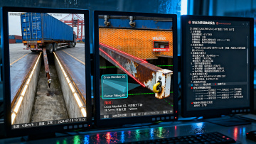 一个现代化的智能仓库内部,具有工业科技感的设计风格,主色调为蓝色和灰色,搭配白色灯光营造出明亮通透的氛围。仓库内采用高顶设计,金属框架结构的货架整齐排列,货架上存放着各种规格的箱子和物品。中央区域配备有自动化的物流设备和机器人,地面上画有黄色的引导线。天花板上安装有长条形的LED灯带和监控设备,墙壁上和货架之间的电子屏幕显示着实时的库存数据和操作信息。整个空间呈现出高度智能化、高效运作的未来感仓储环境,光影效果突出金属和玻璃材质的冷硬质感,同时通过蓝色的科技光晕增添现代感和专业度。