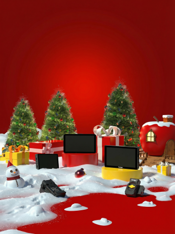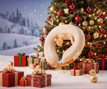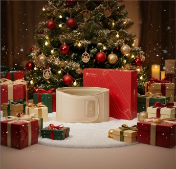 喜庆红绿配色,科技感水牙线置于礼盒中,重拟物风与塑料质感结合,双色设计凸显现代感,节日氛围浓厚。
