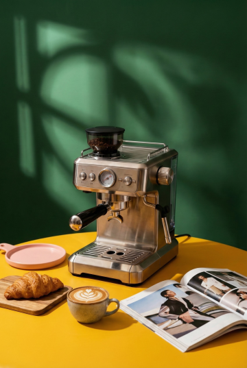 现代感与清新感交织的扁平风插画,结合轻拟物设计手法,展现科技感咖啡机与时尚生活场景,简约主义美学搭配明亮色彩,传递舒适惬意的晨间仪式。