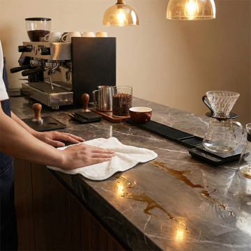 现代简约风格厨房场景,不锈钢材质的银色水龙头安装在白色石英石台面上的嵌入式水槽边缘,水龙头线条流畅、设计简洁,带有弯曲的出水嘴和旋钮式开关,表面光滑且有金属反光质感。台面干净整洁,左侧窗台上摆放着一盆盛开的白色百合花,右侧窗台上放置着几个新鲜的青柠和柠檬,窗外透进明亮的自然光,光线柔和地洒在台面和水龙头上,形成淡淡的阴影和高光,整体氛围清新、明亮、整洁、温馨,具有现代家居的舒适感和简约美学。