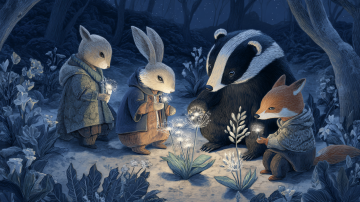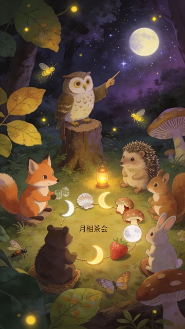 虫眼仰视视角,温暖绘本插画风格,融合碧翠克斯·波特(彼得兔作者)的自然细节与宫崎骏的奇幻氛围:夜晚魔法森林空地,小狐狸举办的“月相茶会” - 用露珠(新月)、半片珍珠母贝壳(上弦月)、圆蘑菇(满月)、被咬的草莓(下弦月)排列出月相序列,萤火虫提着微型灯笼照亮每个“月相”,猫头鹰老师站在树桩上指着星空,其他小动物(刺猬、松鼠、兔子)围坐倾听,每片叶子脉络、蘑菇菌褶、昆虫翅膀纹理、动物毛发都细腻可爱,月光透过树叶形成光斑,色调为暖褐、萤光黄、森林绿、夜紫罗兰,童话光影,细节丰富如自然图鉴,8K