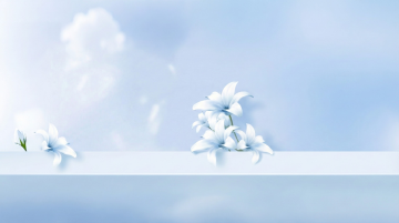 极简主义风格的场景,明亮通透的蓝天白云背景,几朵蓬松的白色云朵分布在清澈的蓝色天空中,画面右下角有两朵盛开的白色小雏菊,黄色的花蕊清晰可见,绿色的花茎和叶子自然舒展,前景是两个叠放的白色长方体平台,表面光滑干净,整体光线充足柔和,营造出清新、简约、宁静的氛围,色调以纯净的蓝、白、绿为主,构图简洁大方,留白充足。