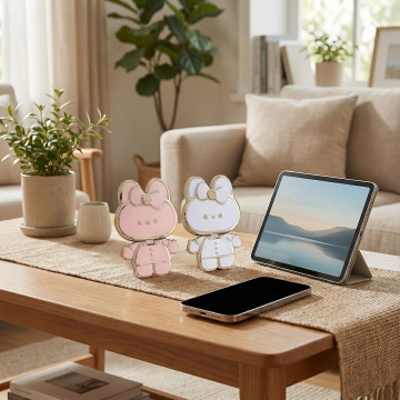 温馨且精致的桌面场景,金色金属网格收纳篮中整齐摆放着三本不同颜色的皮质笔记本,从左到右分别是淡紫色、明黄色和浅粉色,每本笔记本都配有白色蕾丝花边装饰的皮质绑带,绑带上有小巧的金色字母装饰。收纳篮放置在柔和的浅粉色桌面上,篮子左侧有一支粉色的笔斜放着,右侧有一个粉色的马卡龙点心。背景中有一个白色的小天使玩偶摆件,底座带有精致的花纹,旁边还有一个粉色的小熊形状便签夹,上面夹着一张写有“你最棒”字样的小卡片。整体画面采用柔和的暖色调光线,光影过渡自然,营造出温暖舒适、充满生活气息的氛围,色彩搭配清新甜美,细节丰富且质感细腻,具有明显的生活美学和温馨家居风格。