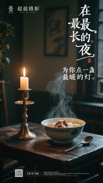 中式感与复古感交织,静谧夜中一盏烛光映照热汤,光影流动间尽显温馨与文艺。国潮风设计融合金属质感与水墨意境,胶片色调渲染出深邃氛围,重拟物手法还原真实温度,传递冬至节气的暖意。