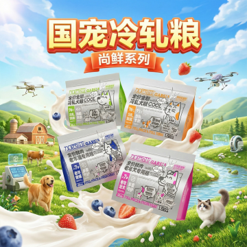 大字风与拟人风结合,哈士奇萌趣探头,狗粮环绕形成隧道视觉冲击,印刷风文字强化促销感,粒子风动态点缀,趣味十足。