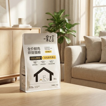 扁平风与轻拟物结合,猫与猫粮袋置于纸箱中,实景感强,清新质朴,传递自然舒适与可爱氛围,节日无特定主题。