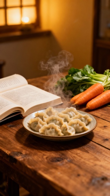 中式感十足的热腾腾饺子,实景质感细腻,质朴木桌与竹席营造温馨氛围,东亚风元素融合重拟物设计,水墨晕染般的蒸汽与木雕纹理相映成趣。