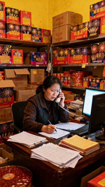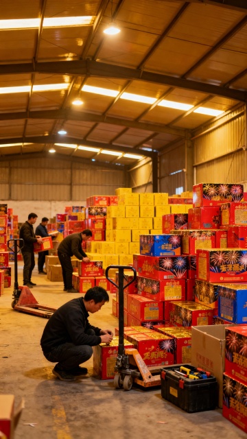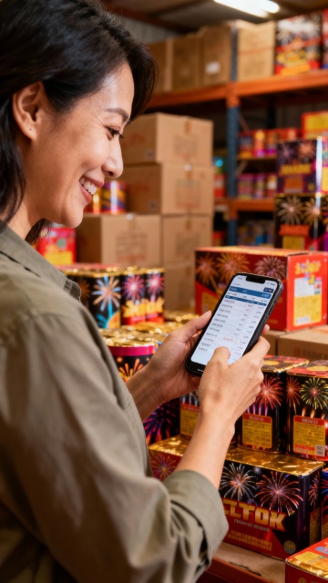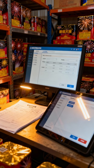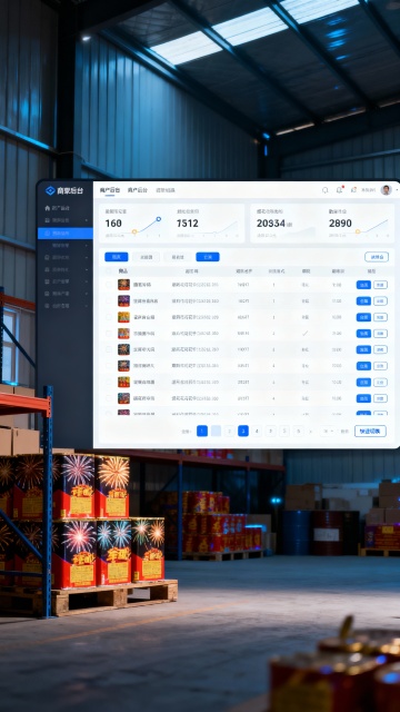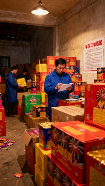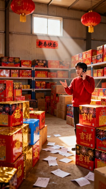 烟花仓库,切换到场景:配送员扫码装车 + 客户在仓库扫码自提特写