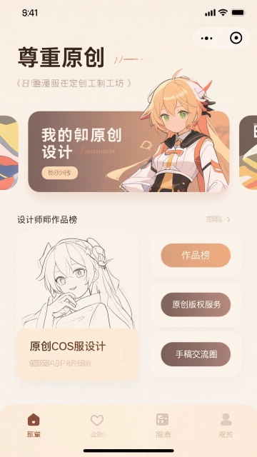 1. 我的原创设计:用户自身原创COS服手稿上传、AI辅助优化、版权登记