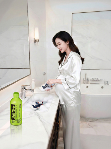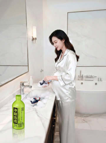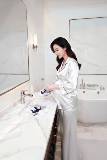 帮我生成几张类似的刷鞋场景图,背景保持不变,模特变成孕妇,衣服不变