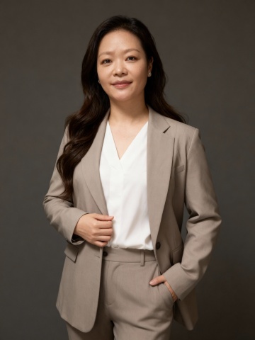 保留人物脸型、发型、年龄特征生成标准职场形象照,50MM焦段,F/4光圈(F/2.8-F/4区间),相机与人物距离3米,横向16:9比例(左右预留环境空间),人物占画面60%,入镜头部至膝盖上方5CM,平视视角,人物居中构图,头肩比例协调,身穿深墨蓝色西装,内搭白色衬衫,精致且高级的深蓝色斜向微微渐隐光泽感极细条纹商务感领带,下装黑色西裤搭配黑色皮带;正面抱胸姿态,肢体舒展的站立姿态,自信从容;主