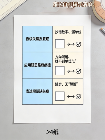 风格统一:真实感手账风 + 教育插画感,柔和色调(蓝/绿/橙为主),无商业logo、无二维码、无文字堆砌 内容聚焦普通家庭场景,体现“可打印”“家长可操作”“孩子参与” 一张手绘风格的A4纸,放在浅灰色桌面上。纸上用清晰表格列出三类问题:【低级失误反复症】抄错数字、漏单位;【应用题思路瘫痪症】方向混淆、找不到单位“1”;【表达规范缺失症】跳步、无“解设”。每项前有空白方框(可打钩),配简单图标(如❌→✅)。整体色调柔和(浅蓝+米白),像家长自制的辅导清单,无复杂设计。