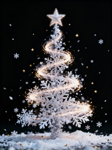 梦幻3D圣诞树,鎏银粒子缠绕雪晶,唯美感与浪漫交织,虚拟自然中的温馨节日奇景。