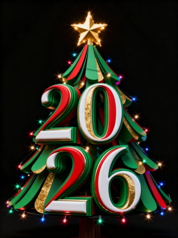 将金色 “2026” 数字层叠成圣诞树,搭配红绿彩灯与星星顶,把新年年份和圣诞形态结合,既显节日氛围,又传递对 2026 年的期待