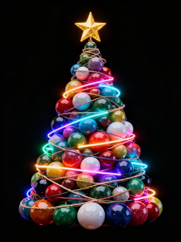 3D风圣诞树,霓虹灯环绕,几何球体堆叠,虚拟现实感十足,喜庆梦幻酷炫交织。