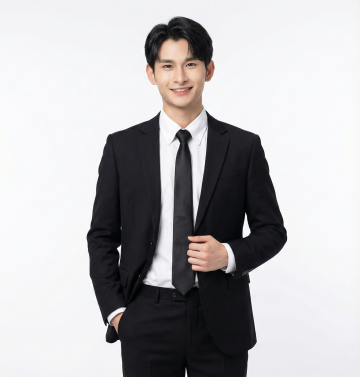 一位年轻亚洲男性,身着剪裁合体的黑色西装,内搭白色衬衫,系着黑色领带,左手自然插在西装裤口袋,右手轻握西装前襟,面带温和微笑,姿态自信挺拔,背景为纯白色,整体呈现清晰、专业、正式的商业人像摄影风格,光线均匀柔和,突出西装的挺括质感与人物的精神面貌。