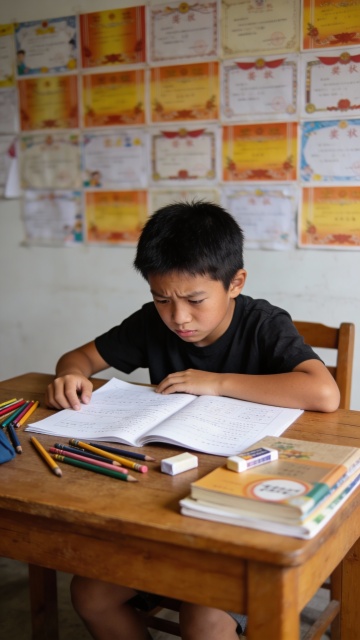 东亚风实景感画面,柔和光影洒落,孩童专注书写,手账风与水彩质感交织,营造温馨舒适、清新质朴的居家学习氛围。