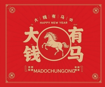 国潮风剪纸与几何造型融合,鎏金文字点缀,红黑配色彰显中式复古喜庆,版画质感传递民族韵味,2026年生肖马主题设计。