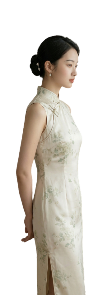 中式古典优雅,国潮风旗袍搭配淡雅花卉,水墨风格尽显东方韵味。