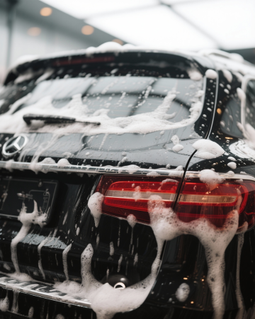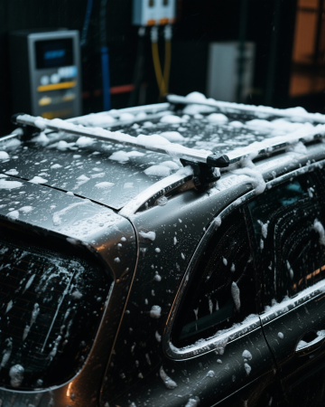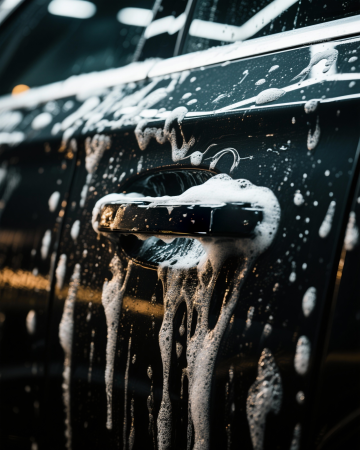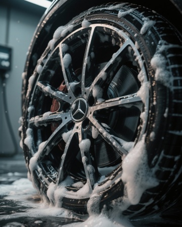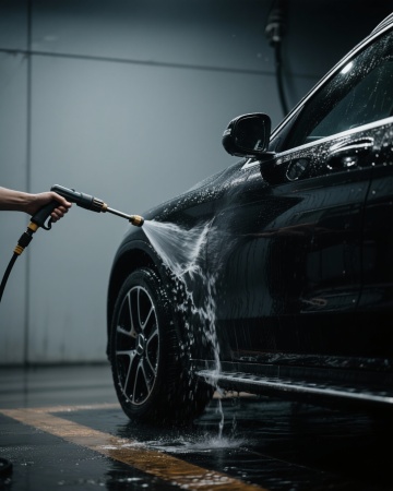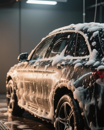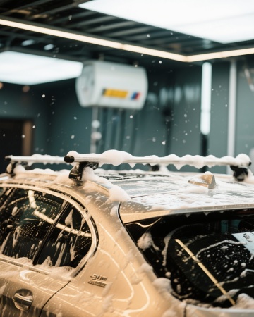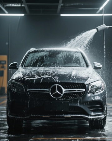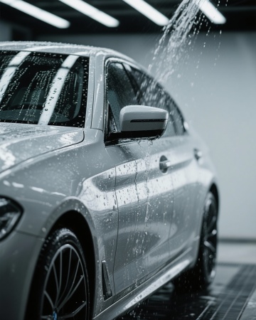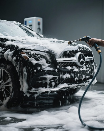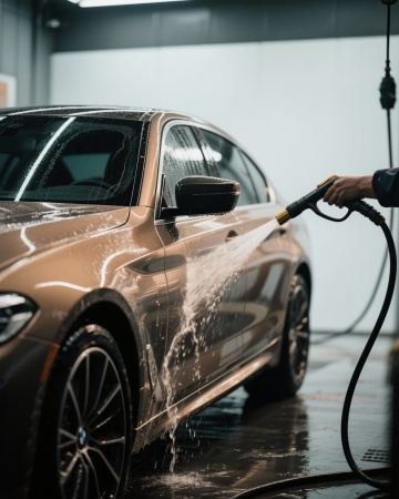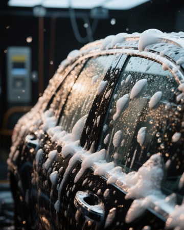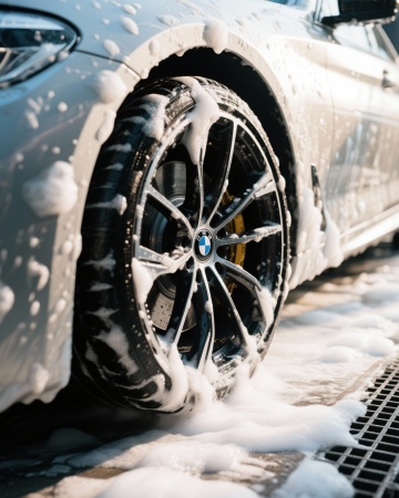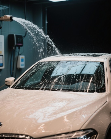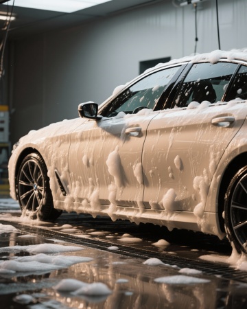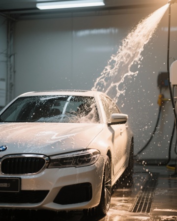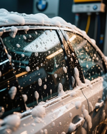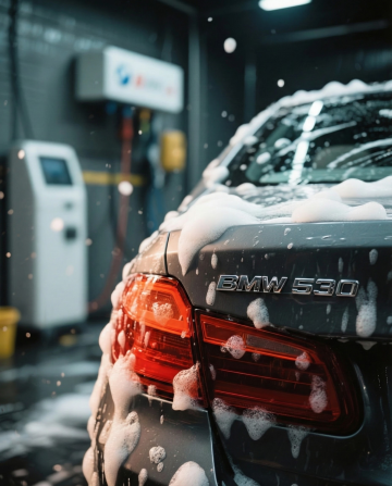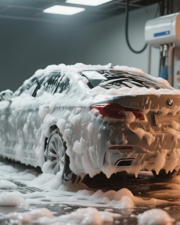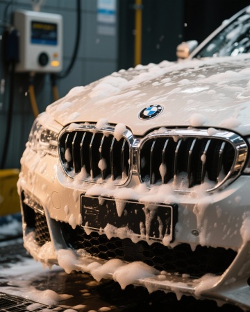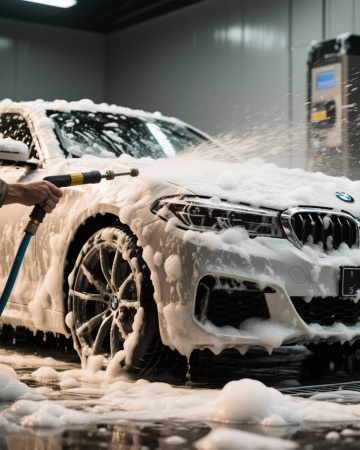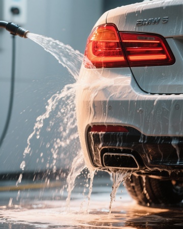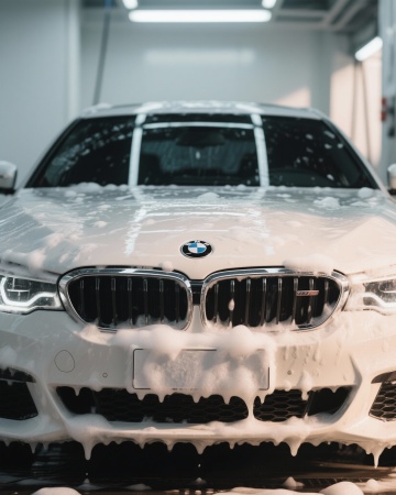 生成自助洗车的图片,车辆为宝马5系,画面要炫酷,高级。生成20张图片,整体局部都需要,背景劲量少,突出汽车泡沫,冲水等画面
