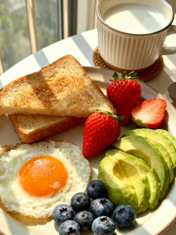 一张温馨生活风格的早餐场景特写照片,晨光从左侧窗户柔和洒落,在白色瓷杯和奶壶上形成细腻的高光与阴影,透明玻璃奶壶正将乳白色的牛奶以优美的弧线缓缓倒入下方带有精致花纹的白色瓷杯,杯口泛起细密的奶泡,牛奶流动的瞬间清晰可见。前景中,白色瓷杯置于配套的白色碟子上,碟子边缘有简约的描金装饰。背景更换为铺着浅灰色亚麻桌布的餐桌,上面摆放着新鲜出炉的金黄色牛角面包、几颗鲜红饱满的草莓和一小束淡雅的白色洋桔梗,整体色调以白色、米色、浅灰为主,点缀着食物的自然色彩,营造出宁静、舒适、充满生活气息的早晨氛围,画面构图采用经典的三分法,焦点集中在牛奶倒入杯中的动态瞬间,背景元素模糊处理以突出主体,光影柔和自然,呈现出温暖治愈的居家感觉。