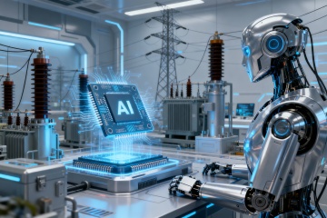未来感蓝色系科技海报,中央为六边形透明保护罩包裹的悬浮AI芯片,芯片表面有精密电路纹路,周围环绕放射状发光电路板,线条流畅且带有淡蓝色光晕,背景为深蓝色网格状电路板图案,整体画面具有强烈的层次感和科技感,光影效果柔和,突出芯片的核心地位,营造出高端、前沿的电子科技氛围。