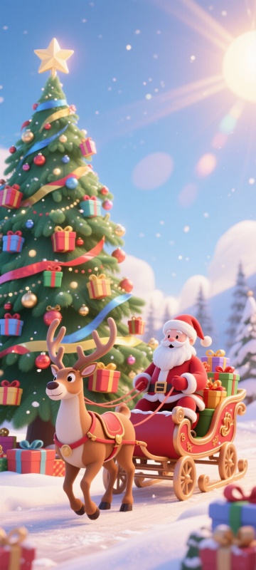 3D卡通风格,梦幻童话里温馨的圣诞场景,阳光洒在巨大的圣诞树上挂满礼物和彩带,圣诞树下,圣诞老人坐在马车上驾着一只麋鹿拉着满满一车的礼物。