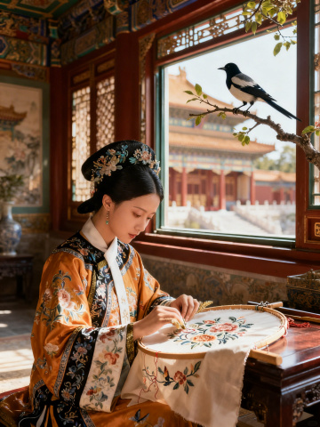 特写镜头,展现一双巧手正在进行创作。一只手用金线在深蓝色的丝绸上绣出玉兔望月的图案,针脚细密,光泽流动。另一只手则在制作一幅结合了剪纸和皮影的艺术品,红色的长城剪纸作为背景,一个半透明的玉兔皮影置于其上,背后有暖黄色的灯光透出,形成迷人的光影效果。背景中,桌面的一角可以看到螺钿漆器闪烁的碎片光芒。整个画面构图精致,充满手作的温暖和古老工艺在现代被唤醒的感动。