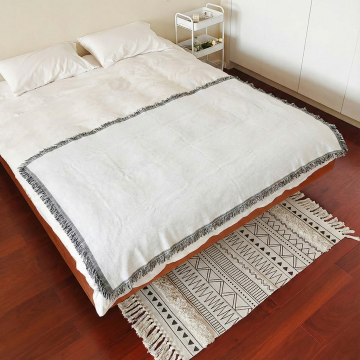 生成两张场景图,产品是图中的沙发巾,场景1:外国白人女模特坐着坐在沙发上看书,身上盖着图中的沙发巾 场景2:外国白人女模特躺在床上,身上盖着图中的沙发巾,要求沙发巾材质细节不变 画质清晰 画面协调 背景可以是奶油风 比例1:1