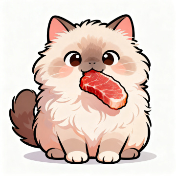 可爱感十足的拟人风猫咪,插画风描边设计,毛发生长细节生动,叼着一块鲜红牛排,萌趣十足。