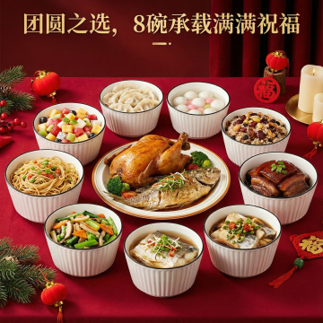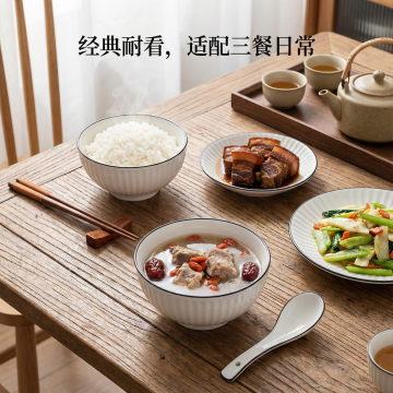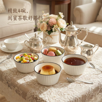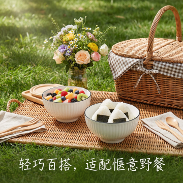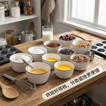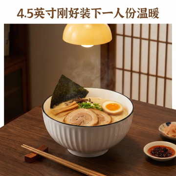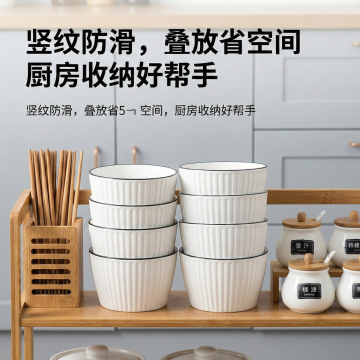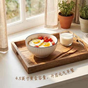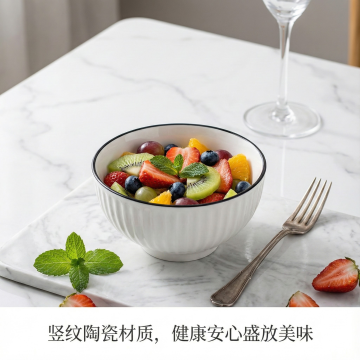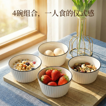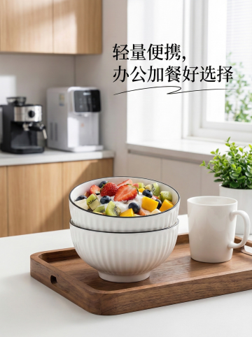 这是一只陶瓷碗,其名称为山田竖纹圆碗,碗口直径为4.5英寸。我给你提供了一张白底图,请根据我的白底图,帮我绘制5张不同角度的场景图。每张场景图比例为1:1,内容是将这只碗与不同的日常生活场景结合,并配上简要的卖点介绍。特别注意生成的场景图中,必须包括两个这样的碗,每个碗的造型、颜色或者样式都不能改变,必须和我提供的白底图一样。碗的大小可以根据场景的不同进行缩放。