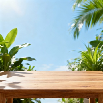 写实摄影风格,晴朗天空下广阔的户外场景,画面下方是深棕色自然纹理的实木地板,地板表面有清晰的木纹和细微的光影变化,呈现出温暖的质感,地板向远方延伸直至与绿色植被相接,两侧是茂密的深绿色树木和灌木丛,枝叶细节丰富,顶部是明亮的蓝天白云,云层形态自然,光线柔和且均匀地洒在地面和植被上,整体氛围开阔、宁静、自然,具有清晰的空间纵深感和真实的色彩还原。