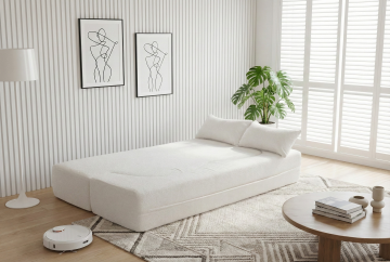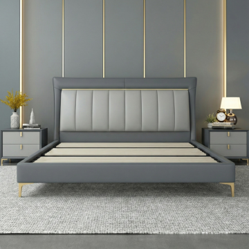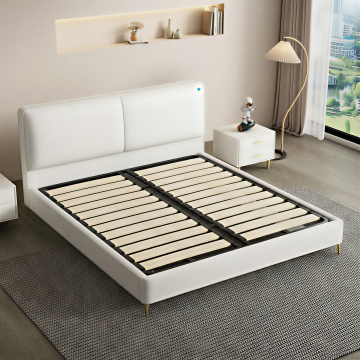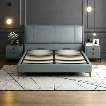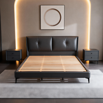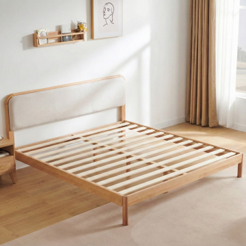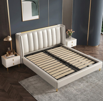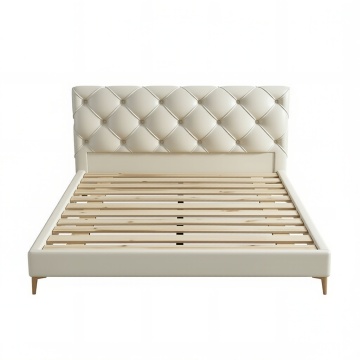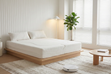 一张温馨的卧室场景,中央是一张铺着棕色床垫的床,床垫表面柔软舒适,带有自然的纹理。阳光透过窗户洒在床垫上,形成温暖的光斑。床头柜上摆放着一盏柔和的台灯和一盆绿色植物,整体色调温暖柔和,营造出舒适、放松的居家氛围。