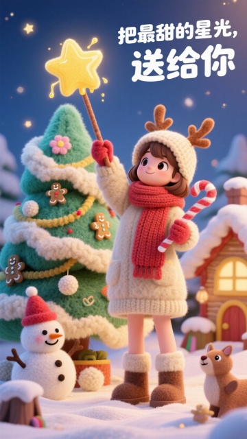 梦幻软3D风格,卡通粘土质感,毛发生长细节,甜蜜圣诞场景,萌趣女孩手持星光棒与拐杖糖,传递温暖节日祝福。