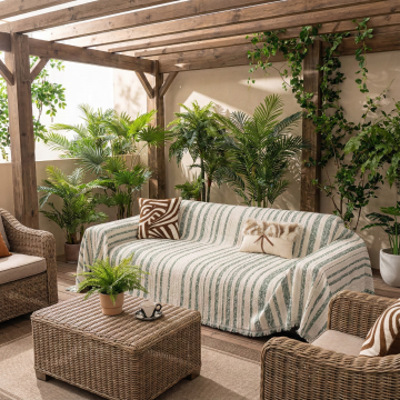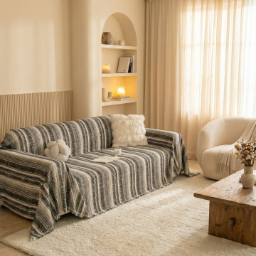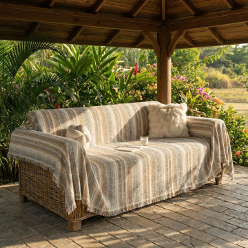 生成三张场景图 产品是图中的沙发和沙发巾,场景展示可以是多角度的 要求保留沙发巾的材质细节,可以多角度展示沙发和沙发巾 场景可以是奶油风的客厅背景,可以是阳台的沙发展示,或者室外露台的沙发巾展示 比例1:1