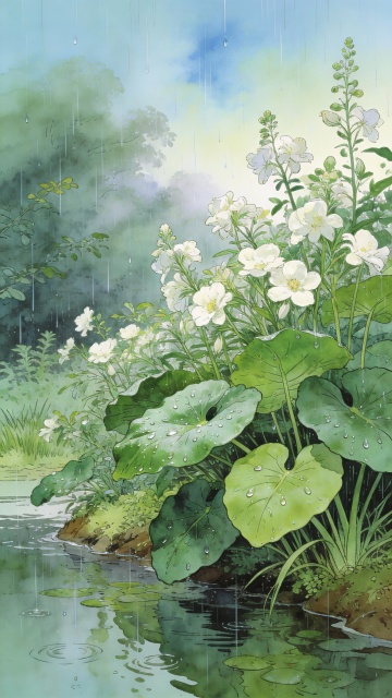 古典中式园林,水彩插画风,清新唯美,花木繁茂,流水潺潺,尽显雅致。