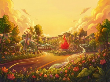 水彩插画风,梦幻清新,舞台灯光与树影交织,营造夏日音乐节的热烈氛围。