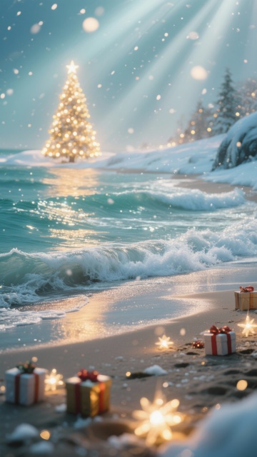 梦幻感与未来感交织的3D几何圣诞树,融合金属风与鎏银风,于热带海滩绽放光影奇观,虚拟自然中点亮节日奇迹。