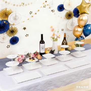 用图二中的三个三层圆形甜品架 三个双层的方形甜品架 四个方形盘子替换图一中的甜品架