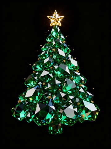3D几何风圣诞树,玻璃质感绿宝石堆叠,金属金星点缀,梦幻奢华,虚拟自然美学,节日氛围浓厚。