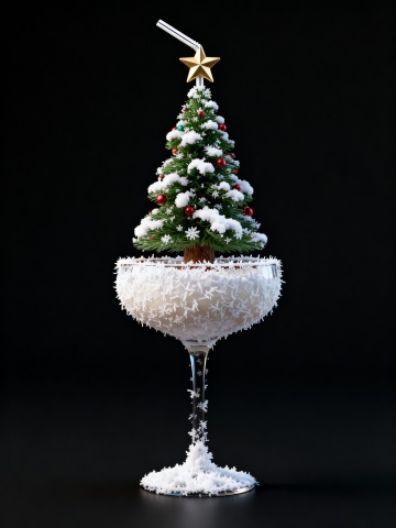 3D微缩艺术风圣诞树鸡尾酒,玻璃杯内雪覆松枝,金色星饰点缀,粒子雪花飘落,营造梦幻温馨的节日氛围。