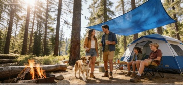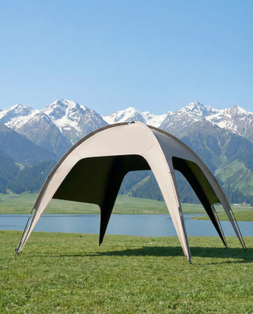 阳光透过茂密的绿色树叶洒下斑驳光影,在开阔的绿色草地上,布置着一个米色帆布帐篷和一个带遮阳棚的露营帐篷,帐篷周围摆放着原木色折叠桌椅,桌上铺着格纹餐布,旁边散落着几个彩色靠垫和一本翻开的书,整体呈现出自然、宁静、舒适的户外露营氛围,高清晰度,写实风格,温暖色调,柔和光线,丰富的细节纹理。