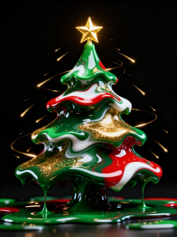 液态风圣诞树,3D重拟物设计,流淌质感与彩铃点缀,喜庆感十足,节日氛围浓郁。