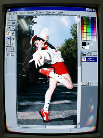 将照片处理为经典 90 年代绘图软件界面中的画布样式,呈现在复古 CRT 显示器上。