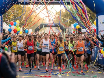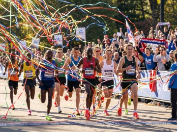 清晨冷色调光线,柔和的蓝色与紫色晨曦,低角度光源从侧面照射,前景跑步者的腿部肌肉与白色运动鞋有清晰的明暗交界线,地面呈现蓝紫色调反光,背景模糊的马拉松人群笼罩在朦胧的冷色晨光中,整体画面保持逆光拍摄的层次感,前景清晰聚焦于迈开的双腿和跑鞋,背景人物呈现剪影效果,冷色调光线营造出清新而充满活力的晨跑氛围,写实摄影风格,高对比度,细腻的皮肤纹理与跑鞋细节,柏油路面的颗粒质感在冷光下清晰可见。