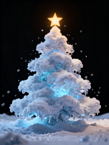 3D风冰晶圣诞树,玻璃质感与光影交织,星夜下透出梦幻唯美感,静谧神秘中绽放冬日浪漫。