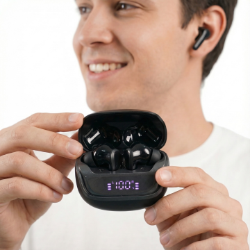 极简主义风格的白色纯色背景,六个不同造型的无线耳机系列产品,每个耳机分别采用完全不同的材质:光滑亮面塑料、磨砂哑光金属、透明水晶质感、柔软硅胶、木质纹理、碳纤维编织,每个耳机造型在保持基本耳机形态的基础上进行独特设计,如圆形、方形、流线型、棱角型等,所有耳机整齐排列成规整的网格布局,保持高清晰度和逼真的材质表现,无任何文字、LOGO、二维码及多余元素,整体画面简洁干净,突出耳机的造型和材质差异。