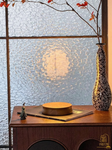特写镜头下的深色实木餐桌,桌面木纹清晰可见,柔和的侧光从右侧木质格栅窗洒入,形成温暖的光影过渡,背景中模糊的深色屏风上隐约透出彩色光斑,整体画面呈现清冷静谧的青灰色调,营造出中式禅意空间的宁静氛围,浅景深处理使前景桌面纹理锐利而背景逐渐虚化,低饱和度色彩搭配细腻的材质质感,光线柔和不刺眼,阴影层次丰富。