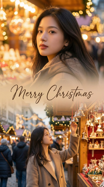 特写镜头,长发披肩女性侧脸特写,发丝为浅亚麻色,别着一枚绿色松枝发夹,身穿米白色亚麻衬衫,外搭浅棕色针织开衫,指尖捏着一朵红色圣诞红,指尖沾着少量白色雪粉,脸颊带着温柔笑意。