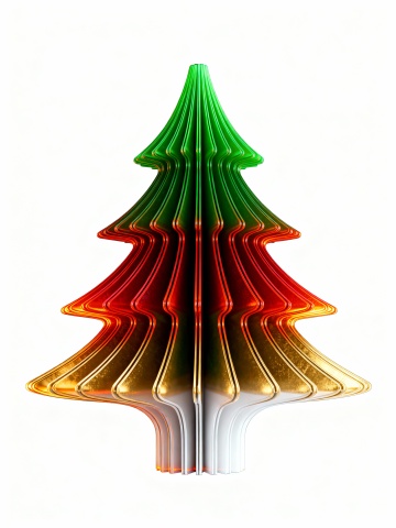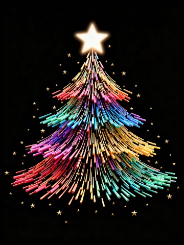 3D几何圣诞树,彩色圆柱构建梦幻体积感,粒子星光点缀,虚拟自然风格,喜庆闪耀。